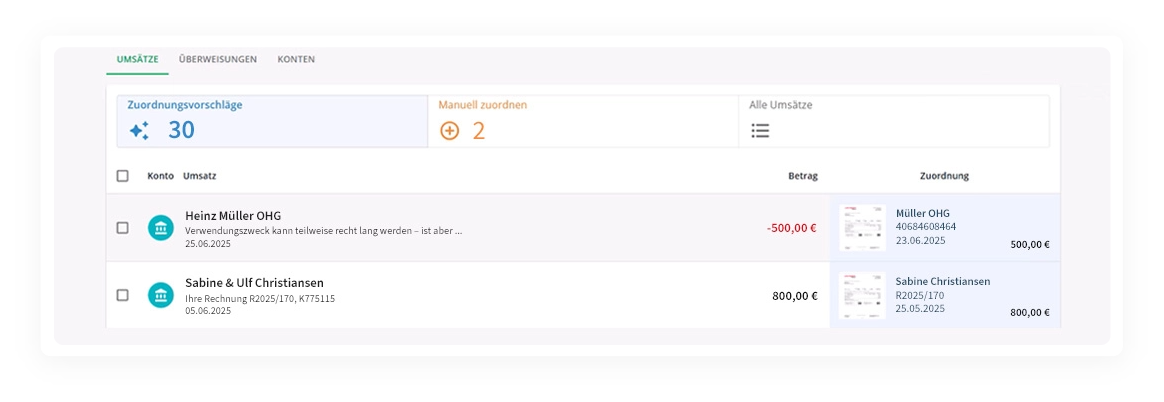 Optimierte, automatisierte Zuordnungsvorschläge - jetzt noch schneller dank passgenauer Daten von Bank und Buchhaltung